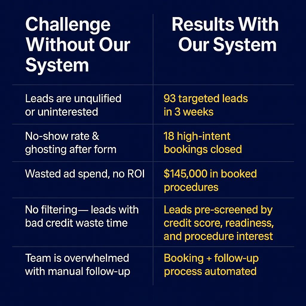 9-11 qualified leads daily, 10-20 premium procedures monthly ($100,000+ additional revenue)